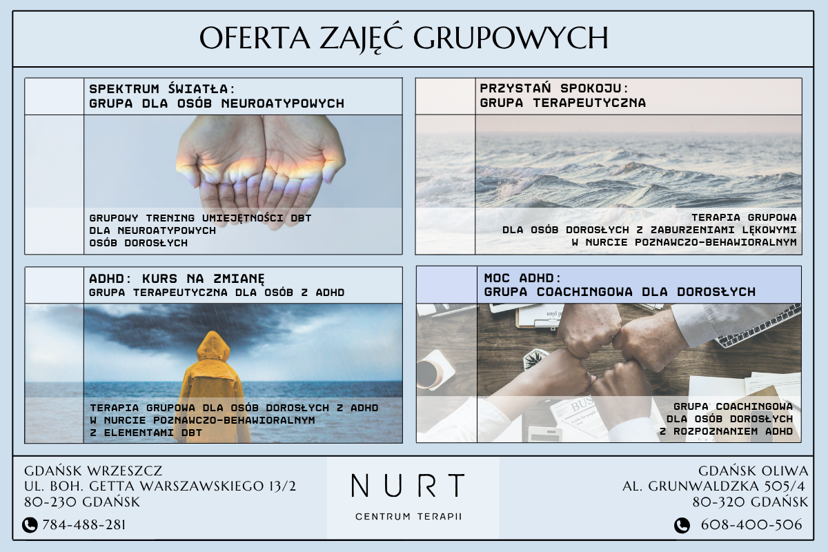W NURT Centrum Terapii wierzymy, że siła grupy i towarzystwo osób przechodzących przez podobne trudności potrafi znacząco wspierać proces leczenia i rozwoju. Nasze...