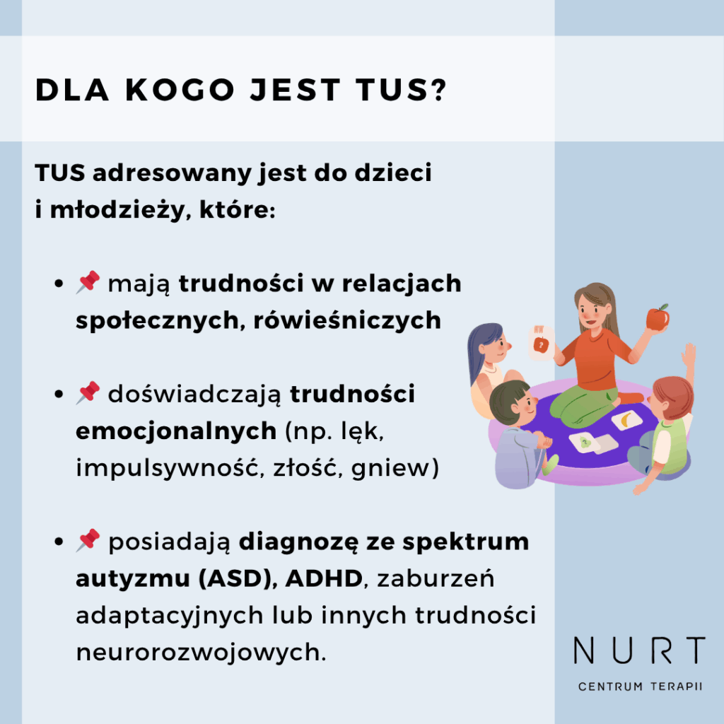 Z TUS-u mogą korzystać także dzieci bez formalnej diagnozy, ale z wyraźnymi trudnościami społecznymi zauważanymi przez rodziców lub nauczycieli.