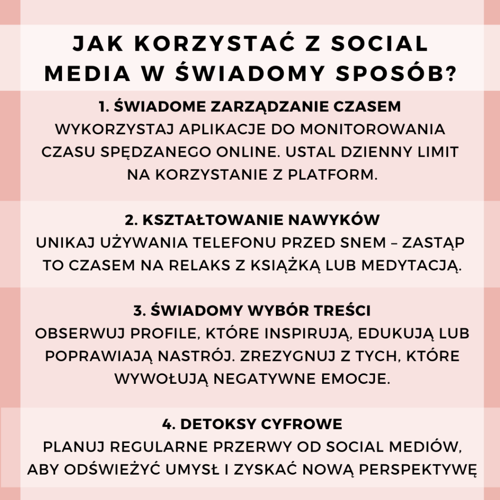 • Pamiętaj, że życie w internecie nie zawsze odzwierciedla rzeczywistość – warto unikać porównywania się do innych użytkowników. Może to negatywnie wpłynąć na samoocenę.