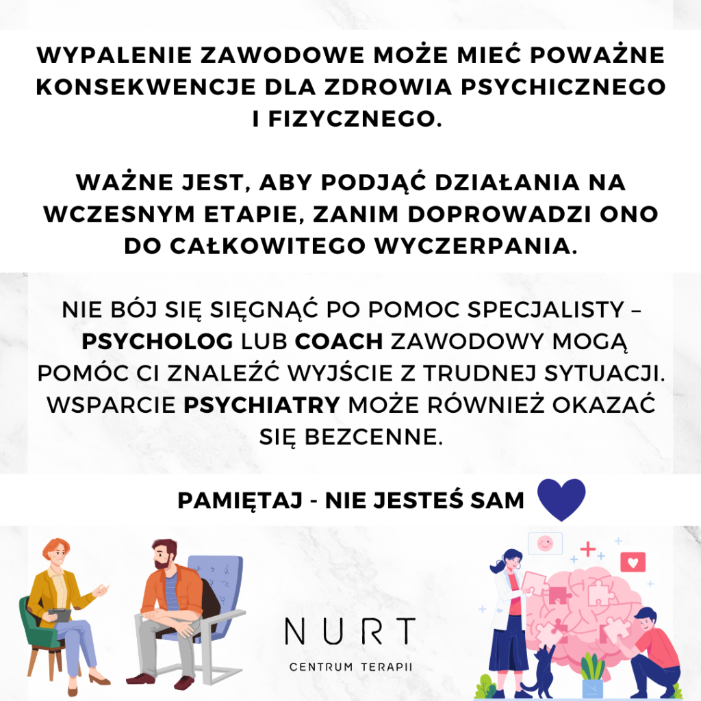 Jeśli objawy wypalenia zawodowego utrzymują się przez dłuższy czas i stają się coraz bardziej uciążliwe, warto zwrócić się po pomoc do specjalisty. Psychoterapia, konsultacje z psychologiem czy terapeutą mogą okazać się kluczowe w procesie wychodzenia z wypalenia. W niektórych przypadkach, gdy wypalenie prowadzi do głębszych problemów emocjonalnych lub psychicznych, może być konieczne leczenie farmakologiczne. Warto nie bagatelizować swoich odczuć i poszukać wsparcia, zanim wypalenie zawodowe negatywnie wpłynie na jakość życia.
